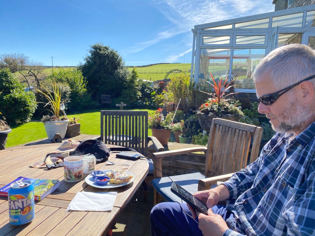 The Commander had heard a rumour about a farm near the track serving tea to walkers. We had been disappointed before, but this time we hit the jackpot. Elaine saw us coming, welcomed us in, showed us the toilets and had a cream tea (that’s what a Devonshire tea is called in England we’ve discovered through trial and error) in front of the Commander and a slice of apple pie in front of me in the sunny garden before you could say aren’t you worried about the cat attacking that chicken.