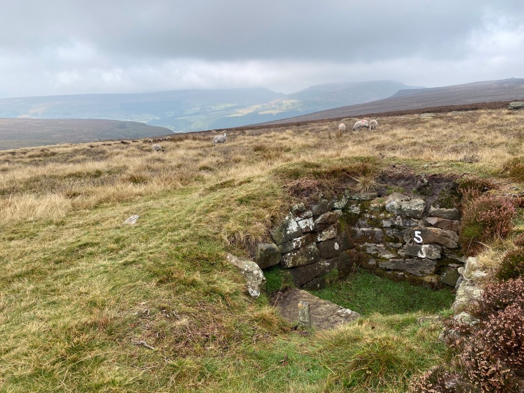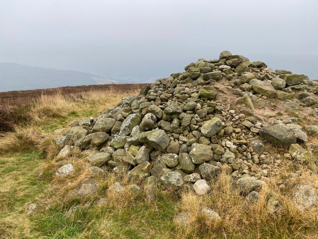 What we’re walking on today is actually the Cleveland Way. As a long established walking route, it is paved almost all the way we walked today with flagstones, making the whole lot much easier to negotiate. I do wonder if eventually the Coast to Coast will be similarly paved and we’ll look back and say we did it when it was difficult and scoff at the young uns. It did start out with a long climb, up into a cloud which stayed with us pretty much the whole day. The very first cairn on the track when we reached the high moor was not much to look at, but a small plaque indicated that it was a Bronze Age burial mound.