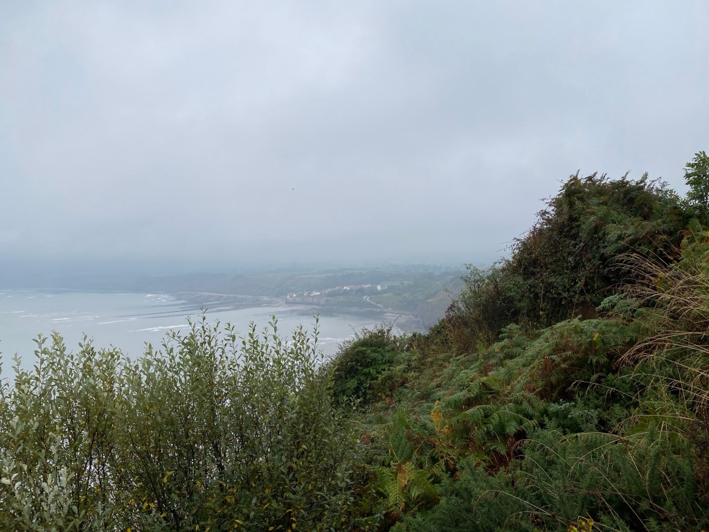 The walk along the cliffs was a bit over five kilometres, with a farewell to pastureland populated with cows and sheep, and the black slugs we’d seen on the paths since the beginning. The first glimpse of Robin Hood’s Bay was supposed to be a delightful surprise, but we could barely make it out through the mist.