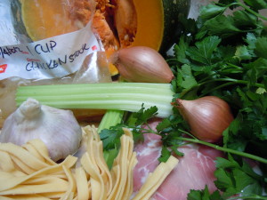 I could, and have, baked bits of it. I can’t blog about that, a child could bake pumpkin, not that they would because then they’d have to eat it. What I’m going to do tonight is make it into a sauce to go on top of the fresh pasta I’ve just bought from Peppe’s. Here’s a picture of the ingredients.