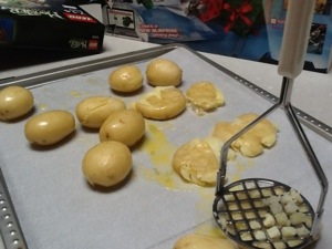 This would probably work for most varieties of potato, but I prefer cocktail potatoes because of the smaller insides to jacket ratio. I work on about three potatoes per child. Boil them until you can stab them through quite easily and their little skins are starting to split like startled frankfurters. Drain them, then put them back in the pot with some slices of butter and toss them around until they are coated. Dump them onto a baking tray lined with baking paper, or not if you have someone else doing the washing up. Get out your potato masher and gently smash them.