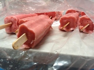 For the Strawberry and Watermelon, I blended up a punnet of strawberries, an equivalent volume of watermelon, the juice of a quarter of a lemon, eighty grams each of icing sugar and condensed milk. It made eight iceblocks. A tip that you may wish to take on board is that it’s a little trying getting them out of the mould. The instructions suggest a gentle squeeze of the plastic is all that’s necessary, but that’s absurdly optimistic. More like thirty seconds dunked in hot water. So what I’ve done is to wait until they’re frozen, unmould them, stick them in a ziplock bag and back in the freezer. Then it’s easy for the kids to get at and the moulds are free for your next batch. Here’s what the Strawberry and Watermelon pops looked like