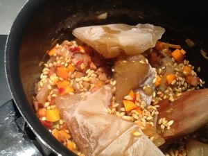You let that simmer, covered, for an hour or so, until all the liquid is absorbed. You turn it off until about twenty minutes before the hordes are due home from soccer training, then you add the optional stuff. This will be any dag ends you find in the fridge. In my case, an aged tomato, some leftover cooked chicken, and no Meriadoc, I won’t be dropping any,