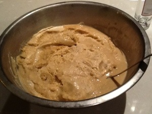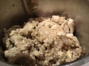 I’m weighing the yeast on a conventional scale because I don’t really trust the Thermomix scale for twenty grams. It’s a bit blasé down that end. So weigh out twenty grams of fresh yeast and bung it in the jug. Add a quarter of a cup of sugar, half a cup (or 130 grams) of buttermilk (my new favourite bread making ingredient) and a cup (or 250 grams) of water. I like to give it a five second zap at this point to mix all that together. Add two teaspoons of mixed spice and six hundred grams of flour. Zap it for about thirty seconds on speed four or until it looks like it’s trying to escape through the lid. Then you put it on closed lid position and press the interval setting and have it go for three minutes.