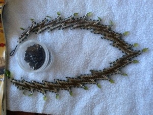 I’ve not offered it for sale, partly because I rather like it, partly because it is too short and narrow and partly because it has about fifty bucks worth of kyanite as dangles. I think it’s kyanite. Kind of an olive green gemstone, in leaf shapes. It’s also useful as a reference for starting a new necklace, it’s always a bit discombobulating.