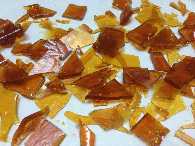 We could go into the chemistry of what’s going on here, and it’s a lot more complicated than you’d think. I’ll restrain myself and just mention that the sugar hasn’t really melted, kind of, because it’s thought that sugar doesn’t actually melt, it decomposes into a whole lot of other compounds, some of which melt at this temperature and some of which don’t, and it’s still kind of in solution with a tiny bit of water. Dumping it onto a cold tray not only recrystallises the sugar and the breakdown compounds, but by doing it fast you’ve also turned it into a glass. Don’t get me started.