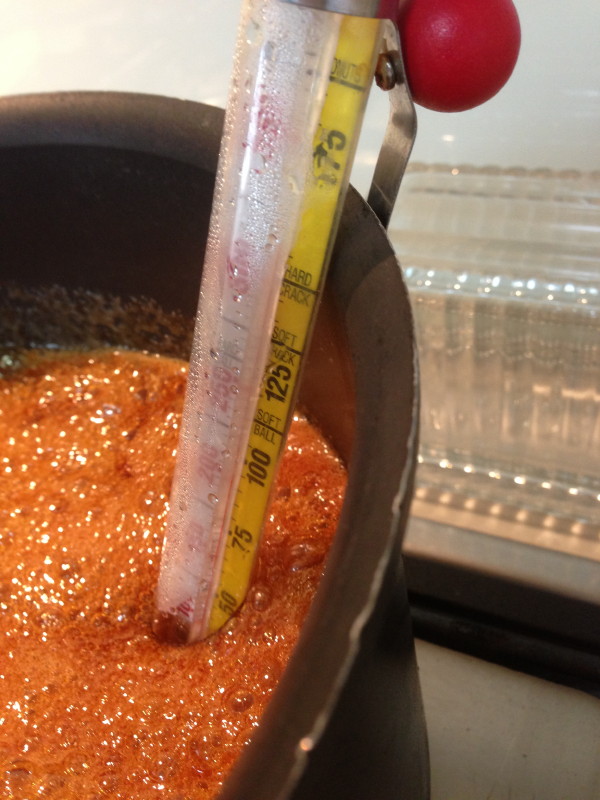 Not too gently, you don’t want to be there all day. You let that bubble away without stirring it until it gets to about 150 degrees Celsius. You determine what the temperature is with a candy thermometer.