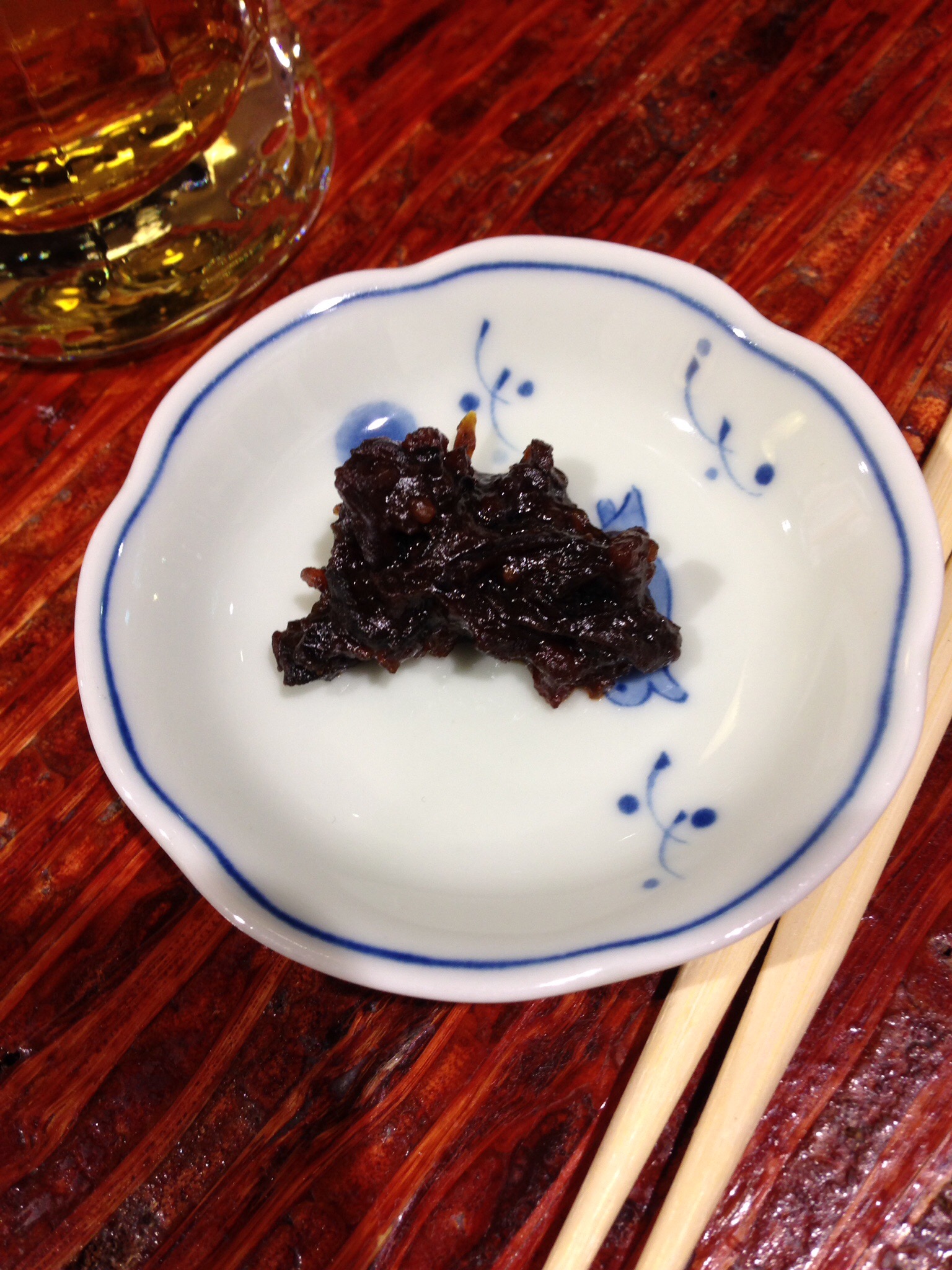 We popped into a local bar, called Snobby’s, not twenty metres from the house we were staying at in Kyoto to try some of the local sake. It was delicious, far better than the rubbish you get at Japanese restaurants at home, smooth and not too alcoholic. We were served with it, by the extremely hospitable non English speaking barkeep, an array of snacks. Rice crackers, good. Macadamia nuts in the shell, OK, plausible. Thermomix sister was offered what turned out to be some form of extremely chewy nougat, not so great with sake, though the sake did help in eventually dissolving it off her teeth. And I was offered a small roll of very effervescent sweets which were slightly reminiscent of trough lolly. Then there was a plate of tiny fish and another of what could have been pickled seaweed which was rather good. Not like the plate of God knows what we were served with a beer at our most recent train station whose name escapes me.