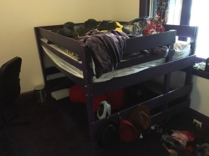It’s a bit hard to tell, but the carpet and trims are the same shade of purple, as is the fleece blanket on the bed. The whole setup makes my teeth hurt, but he likes it. Anyway, five minutes before Bunkers looms that giant warehouse. I explained to the Horror what it was. He said we had to go.