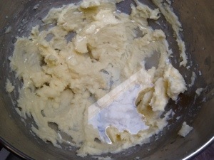 Cream together ninety grams of butter with three quarters of a cup of sugar. Add a teaspoon of vanilla essence and an egg and cream some more. Add an egg yolk and incorporate that also. I found some nifty little glass saucers with lids for keeping just such a thing as left over egg whites.