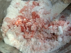 I made some icing, by mixing the leftover strawberry pulp with thirty grams of sweet butter and three cups of icing sugar. You can just mix it up with a spatula, you don’t need heavy machinery.