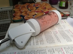 So far, so successful. If I was serving these as butterfly cakes, I’d slice a wedge out of the top, slide some strawberry jam into the cavity, slap some King Island cream on top, put the wedge back on and slather a bit of strawberry icing on and there you go. I did the jam bit.