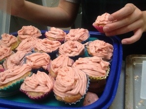 “I asked Janie whether she liked vanilla, chocolate or strawberry, and she likes strawberry. So can you make a strawberry cake with cream like you do for our birthdays? Tomorrow?” Hold on a minute. For a start I’m sure the teachers won’t want to mess about with a cake. I’ll do it as cupcakes. And you can’t have cream and fresh strawberries, they need to be put on when you serve it, that will be way too fiddly. How many will you need? “Um, there’s fourteen girls in my home room, so, ummm….” I start to wonder if she’s fallen into a coma. “Thirty four!” she finally says brightly, then skips off to bring havoc to someone else’s life,