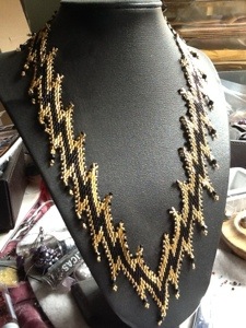 I like to include Swarovski crystals wherever I can, and they only actually do two shades of solid white, chalk and alabaster. I only have alabaster, so that makes my white decision simple, stark white it is. The Ball invitation also suggests a touch of silver, so that’s going in too. The Bargello pattern that I use is from a 2006 edition of Bead and Button magazine and I’ve found that the pattern as written is a bit narrow and too short. The first Bargello necklace I made is the only one I’ve kept, here it is.