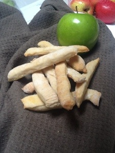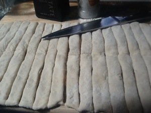 Place in a bowl twenty grams of fresh yeast with three hundred and fifty grams of water. Squash up the yeast with a fork until it’s dissolved. Add five hundred grams of flour and about ten twists of the salt shaker. Mx it all up with your hands until the flour is incorporated, then cover it with a damp tea towel and go fold sheets for about ten minutes. Pour a slug of nice olive oil over the dough and knead it in. Go pay a phone bill or two. Repeat with the olive oil and the ten minute pause until you’ve done it three times. Leave the dough covered in a warm place to rise until it has doubled in size. This is very dependent on how warm the spot you’ve left it in is. Often I put it in the oven with just the light on, but today my oven is occupied with ginger nuts, so I’ve placed it in the square of sunlight that comes through the kitchen skylight and moves like a laser beam through the room during the afternoon, melting everything in its deadly path.